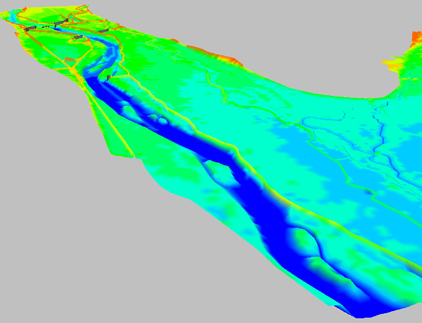 Une autre manière de représenter le relief s’appuie sur le modèle numérique de terrain (MNT). Un MNT est construit à partir de toutes les données topographiques et bathymétriques disponibles et celles collectées en début d’étude (éléments existants ou nouveaux relevés).